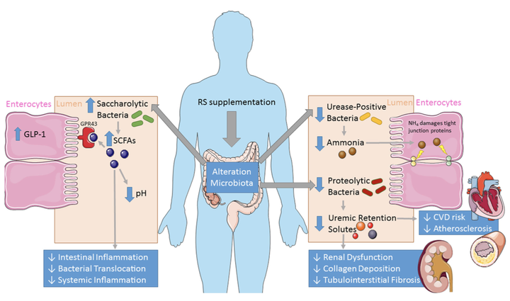 Chronic kidney disease (CKD) has been associated with changes in gut microbial ecology, or “dysbiosis,” which may contribute to disease progression. Recent studies have focused on dietary approaches to favorably alter the composition of the gut microbial communities as a treatment method in CKD. Resistant starch (RS), a prebiotic that promotes proliferation of gut bacteria such as Bifidobacteria and Lactobacilli, increases the production of metabolites including short-chain fatty acids, which confer a number of health-promoting benefits. However, there is a lack of mechanistic insight into how these metabolites can positively influence renal health. Emerging evidence shows that microbiota-derived metabolites can regulate the incretin axis and mitigate inflammation via expansion of regulatory T cells. Studies from animal models and patients with CKD show that RS supplementation attenuates the concentrations of uremic retention solutes, including indoxyl sulfate and p-cresyl sulfate. Here, we present the current state of knowledge linking the microbiome to CKD, we explore the efficacy of RS in animal models of CKD and in humans with the condition, and we discuss how RS supplementation could be a promising dietary approach for slowing CKD progression.